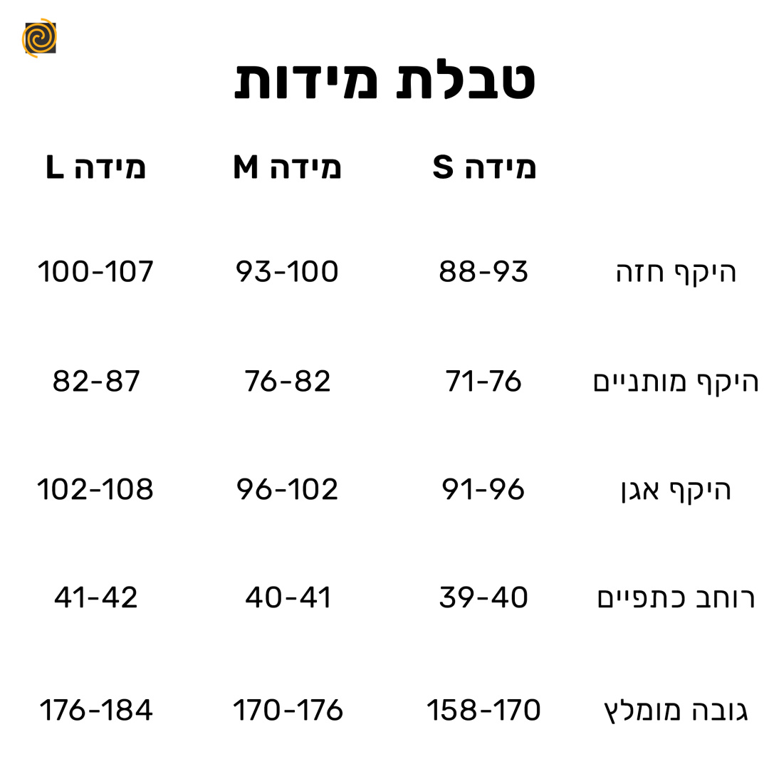 *המידות בס"מ, מומלץ לבחור מידה לפי גובה ומבנה גוף.