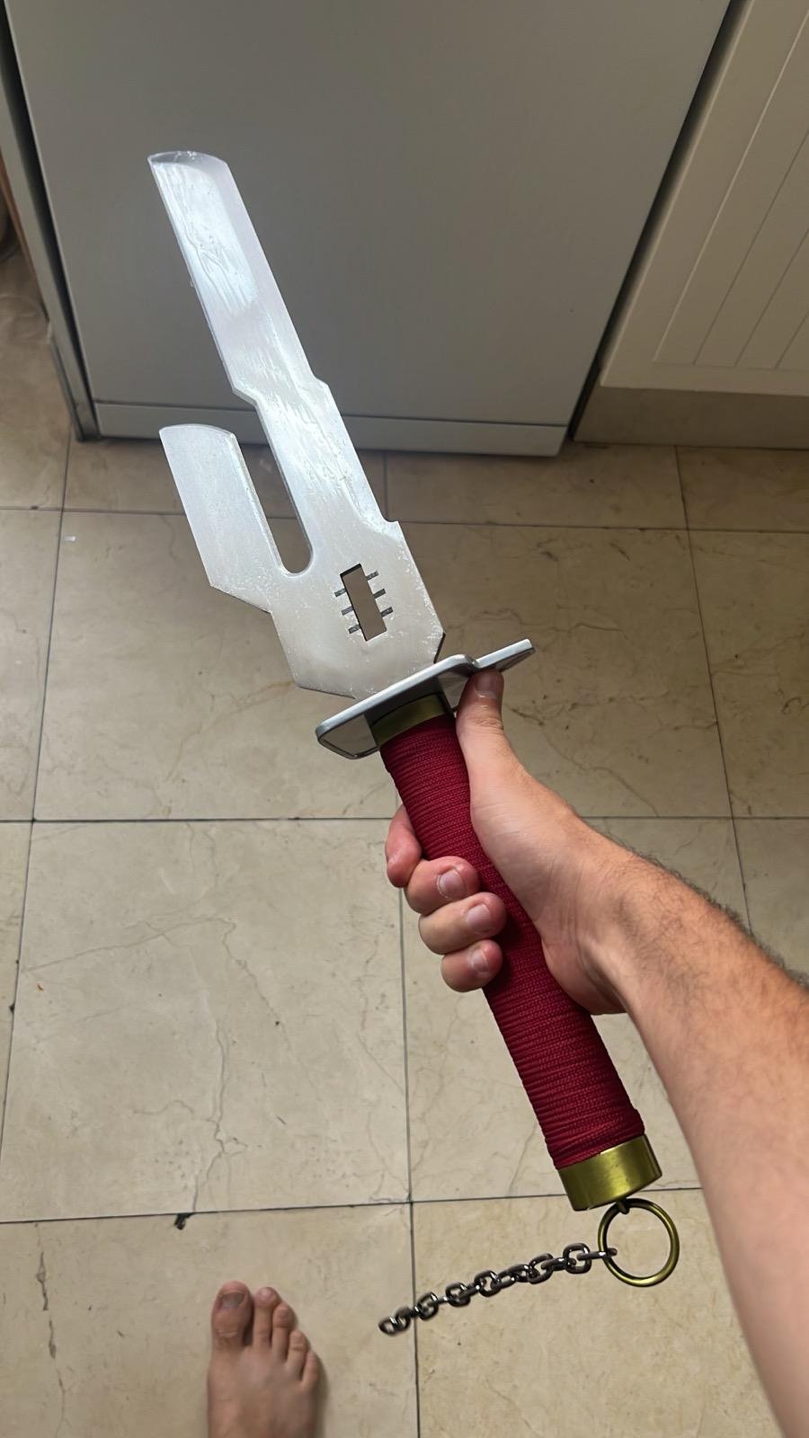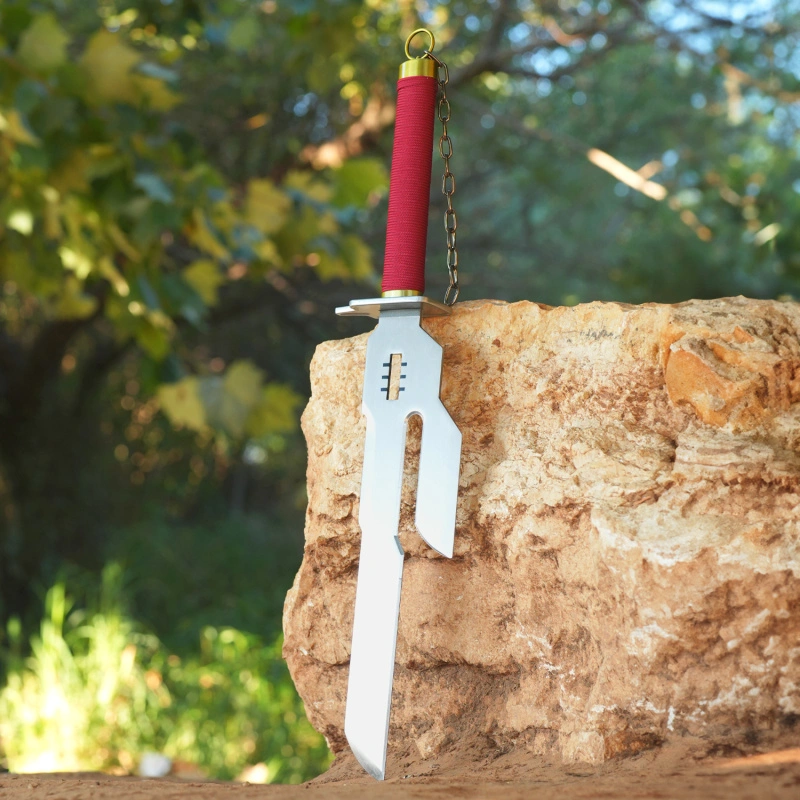 חרב אדירה בגודל 68 ס"מ מפלדת אל חלד מבריקה ובד אדום כרוך סביב הידית.